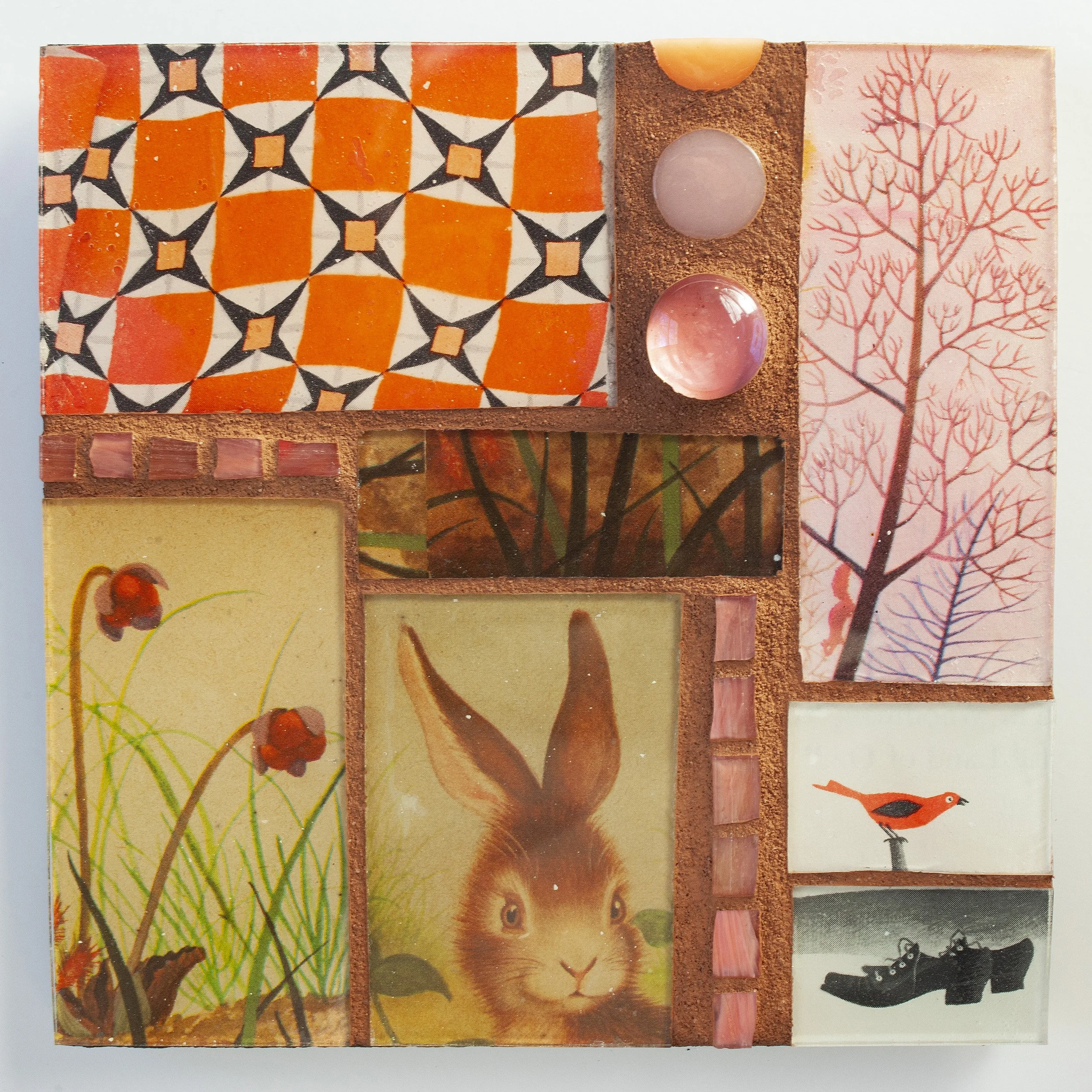 Here is my exploration of paper under glass with the addition of all the materials that I love: hand tinted thinset backed glass gems, glass rods and vitreous glass tiles. Most of these papers are from magazines that my family subscribed to in my childhood and books that were read by my older brother and passed down to the younger children. Are they mosaics? Are they collage? I see them as a blend of the two and I enjoy playing around with this new form that has been on my list to try for some time. This is only the beginning!